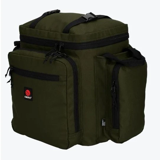 - Large, zipped front pocket sized to accomodate tackle box or accessories, additional zip pockets on front, both sides and inside of lid, large pocket inside main compartment