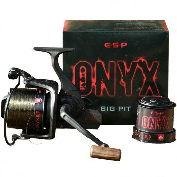 The Onyx Big Pit reel features a matt black finish with subtle red decals and wooden handle.