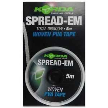 Korda Spread-Em is a woven tape that has a coarse texture to its flat cross-section. This makes it perfect for stringers because the cross-section will actually hold the baits apart even with the force of the cast.