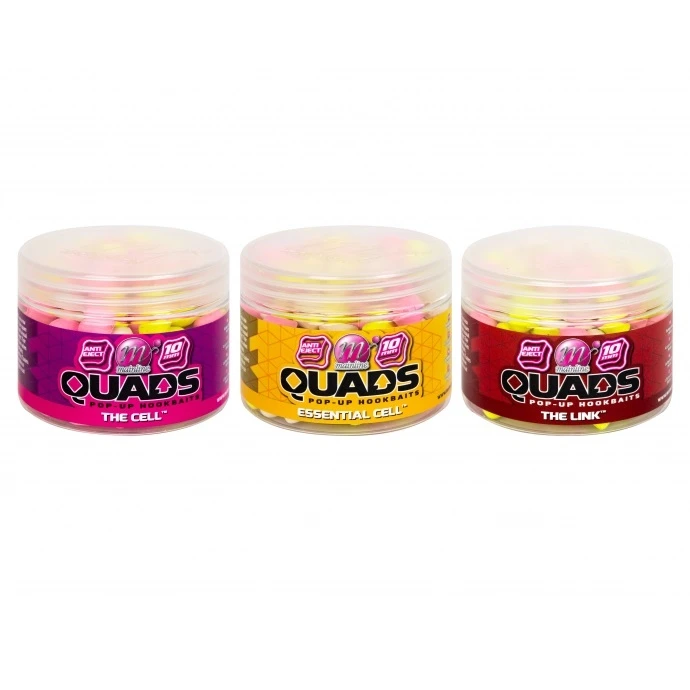 Mainline ‘QUADS’ are a new concept within our extensive range of hookbaits. Their square shape means they’re both unusual and harder for fish to eject. Their size means they lend themselves perfectly to single hookbaits, use with particles with the pop-up version providing the ideal topper to balance out bottom baits or even use as a high attract Zig or flaoting surface hookbait! Available as pop-ups or bottom baits to suit any presentation!