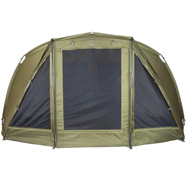 A really well made two-man dome-style bivvy with a clever unique patented design! Incredibly strong, and easy to put up with an ultra-strong machined aluminium block holding everything together. These will comfortably fit a pair of bedchairs, anglers and their assorted kit with room to spare! With a solid front door, and side panels that can be rolled back to a breathable mozzi mesh screen and additional twin rear vents allowing better airflow in the summer months, you can remain comfortable inside whatever the weather.